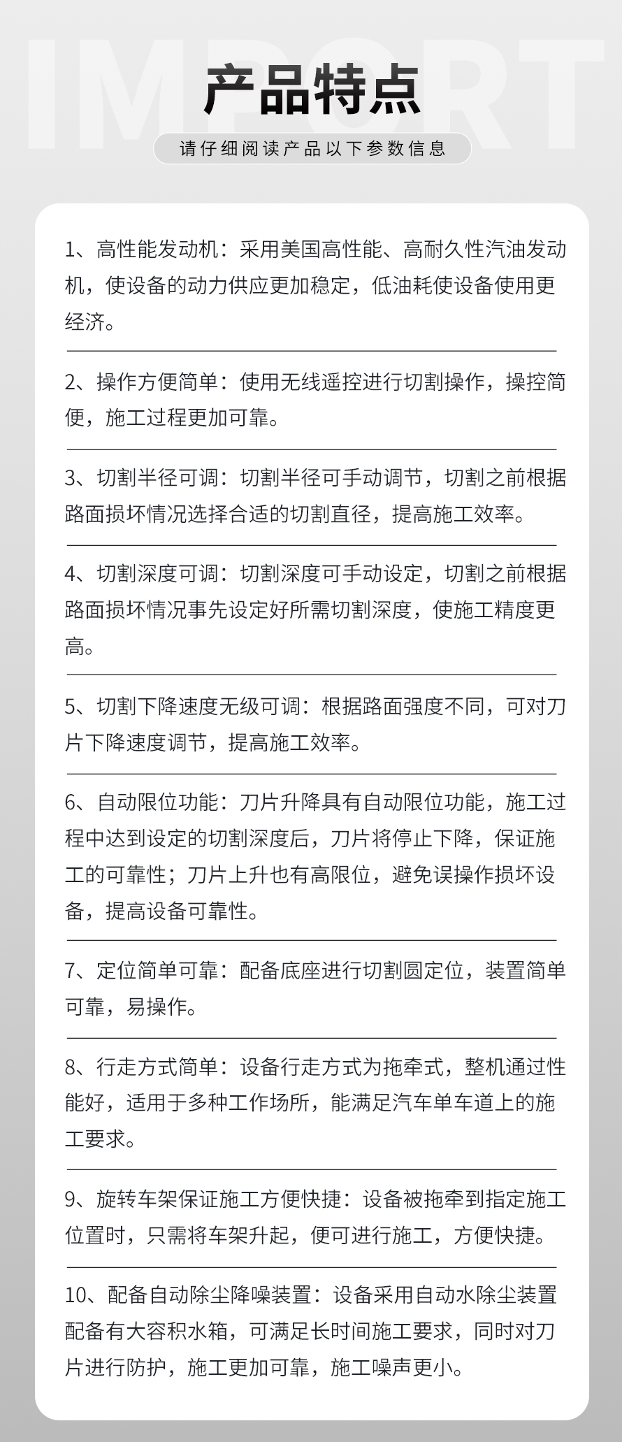 專門用于對城市道路中機動車道等井蓋周圍的水泥混凝土或瀝青路面進行圓形切割。為清楚井蓋周圍的破損路面提供分割區(qū)域,修復后的地面美觀,延長了路面的使用壽命。