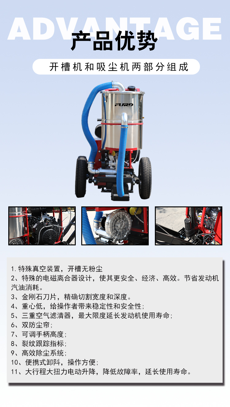 自吸塵式路面開槽機(jī)主要用于瀝青路面修補(bǔ)裂縫開槽的機(jī)械,其集吸塵、開槽為一體,環(huán)保性好,工作效果高,是路面開槽施工不錯(cuò)的選擇。
