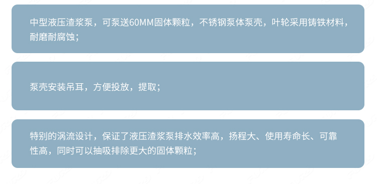 中型液壓渣漿泵,可泵送60mm固體顆粒,不銹鋼泵體泵殼,葉輪采用鑄鐵材料,耐磨耐腐蝕;
